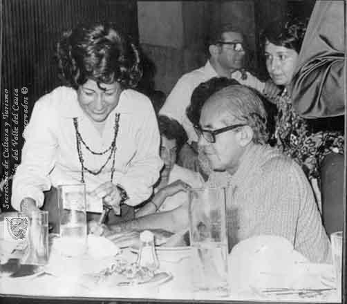 Lucy Murgueitio y Alfonso López Michelsen, reunidos en el Club Orión, ajustando los detalles de su campaña presidencial. Cartago. C. 1974.