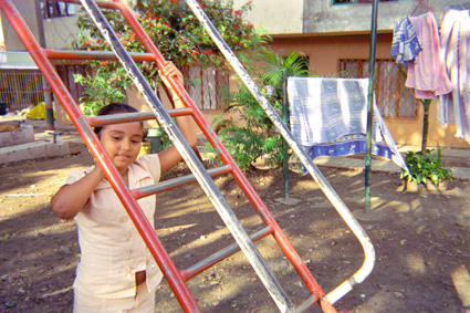 Plano medio de una niña, donde se destaca al extremo izquierda una escalera en metal de color rojo y blanco. La niña está vestida de color rosado, junto a la escalera. Al extremo derecho un tendedero de ropa. Al fondo la fachada de una vivienda.