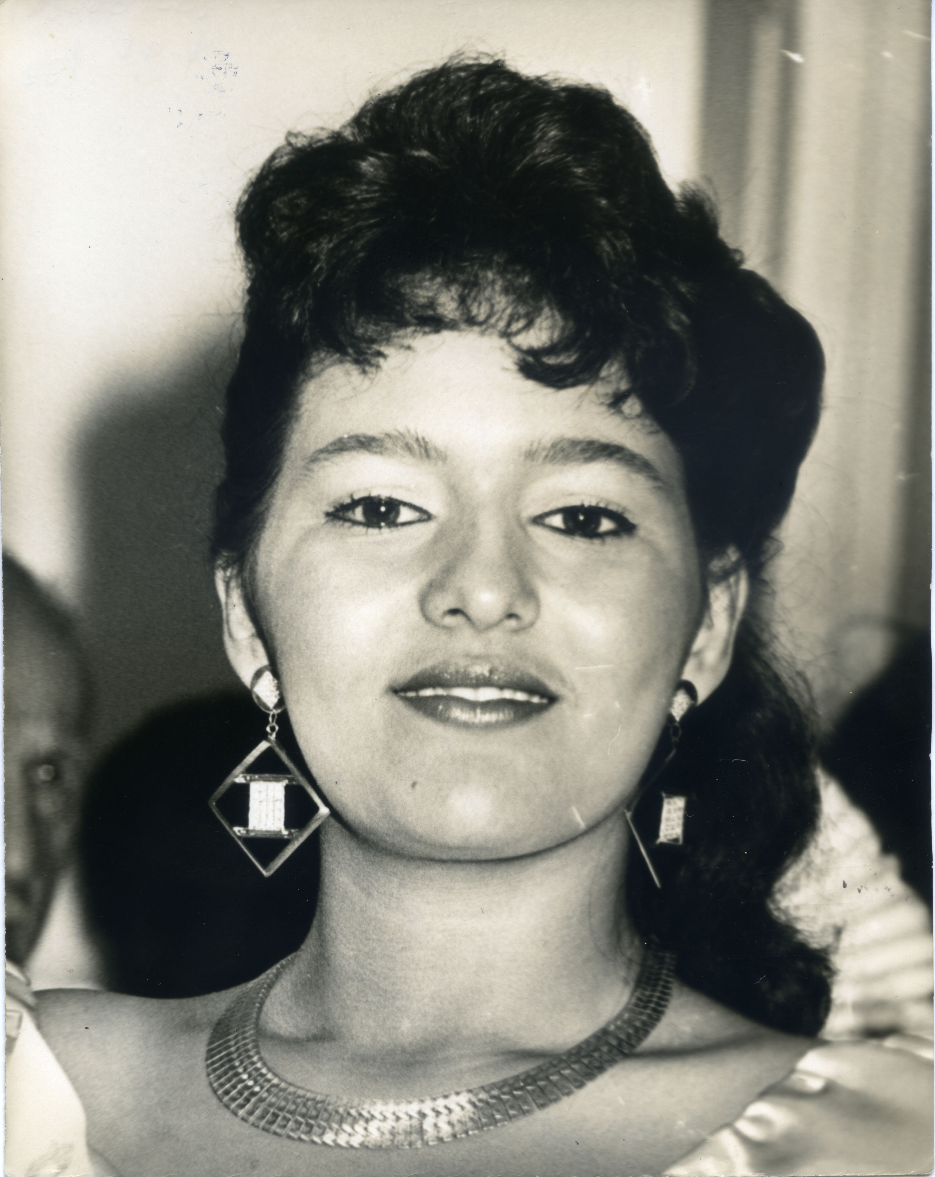 Fotografía de primer plano corto de una persona, a la cual se le ve sonriente, con un peinado alto, en su cuello luce una gargantilla ancha, se le aprecian dos aretes en figura geométrica en sus orejas,