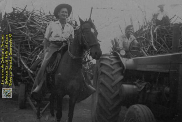 Trabajadores del Ingenio Providencia en plena tarea. Se destacan tres tipo de trabajadores: el motorista del tren cañero, sobre la caña en un vagón el señor que le va avisanso al motorista las visicitudes del camino o carretera, y sobre el caballo, el capataz de campo o supervisor de campo. El Cerrito, C. 1960.