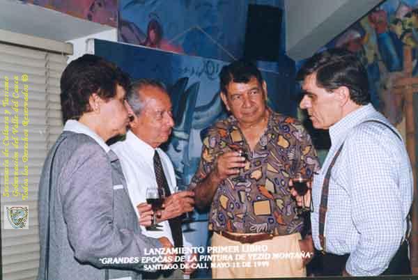 El Mastro Yesid Montaño, médico Armando Collazos y el Dr. Ledo Spodini, departiendo una copa de vino, en el lanzamiento del primer libro del maestro Montaño titulado " Grandes épocas de la pintura de Yezid Montaña". Santiago de Cali, 1.999