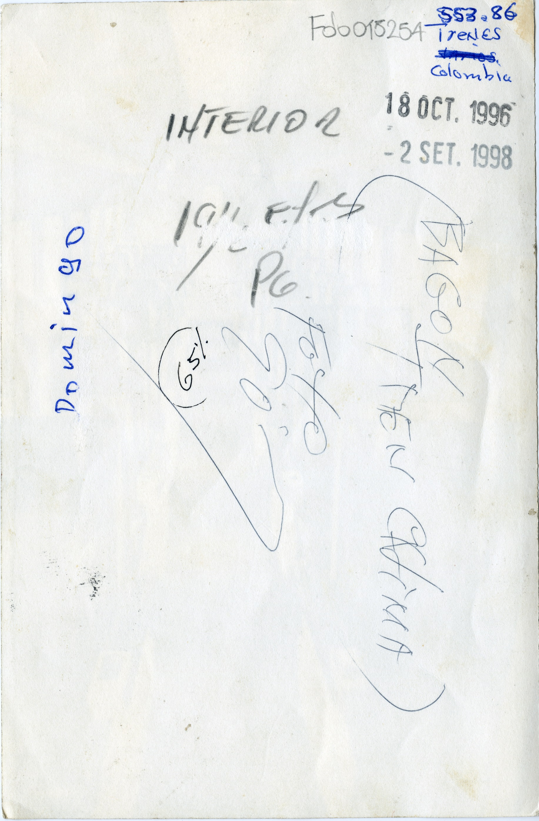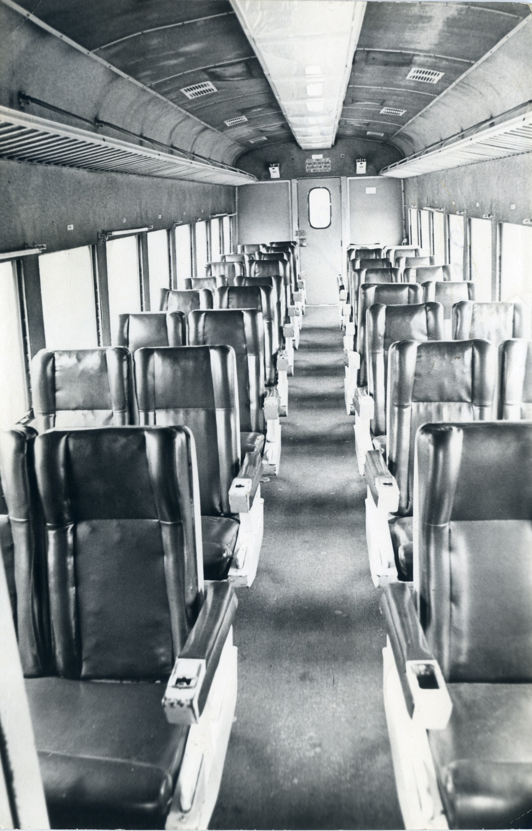 Interior del tren. apreciamos el estilo de asientos. En la fotografía se revela la siguiente información: "Trenes Colombia, vagón tren Calima".