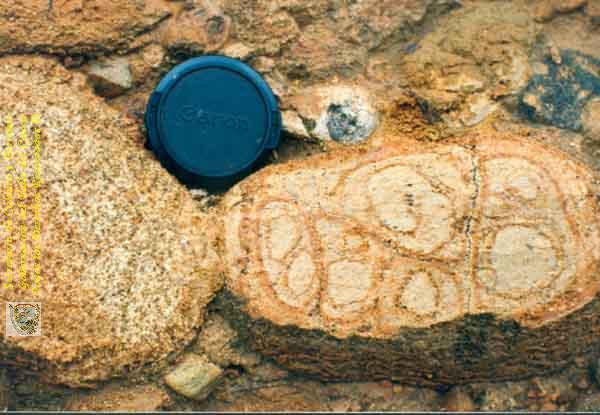 Anillos de meteorización en saprolito de balasto, encontrados en el barrio Santa Teresita. Santiago de Cali, C. 1990