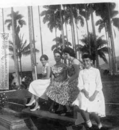 María Cielo Mejía, Aura Gutierrez, Leda Velásquez. En el parque central de Caicedonia. C. 1961