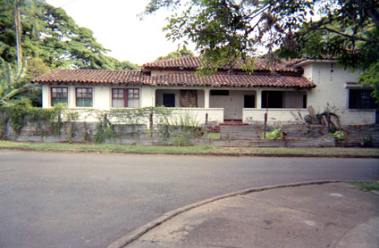 Plano medio. Toma frontal de casa rodeada de vegetación.