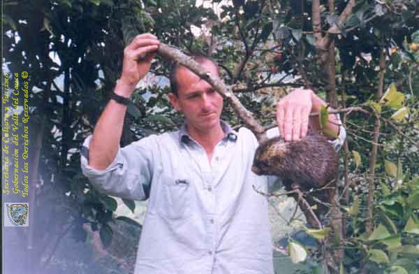 Gerardo Galvis colgando un erizo , Vereda Santa Helena, finca Pradera. El Aguila, es un paraíso natural del Valle del Cauca, con grandes reservas y sitios naturales ricos en biodiversidad, para el disfrute de los vallecaucanos, foto tomada en el año. C. 2000.