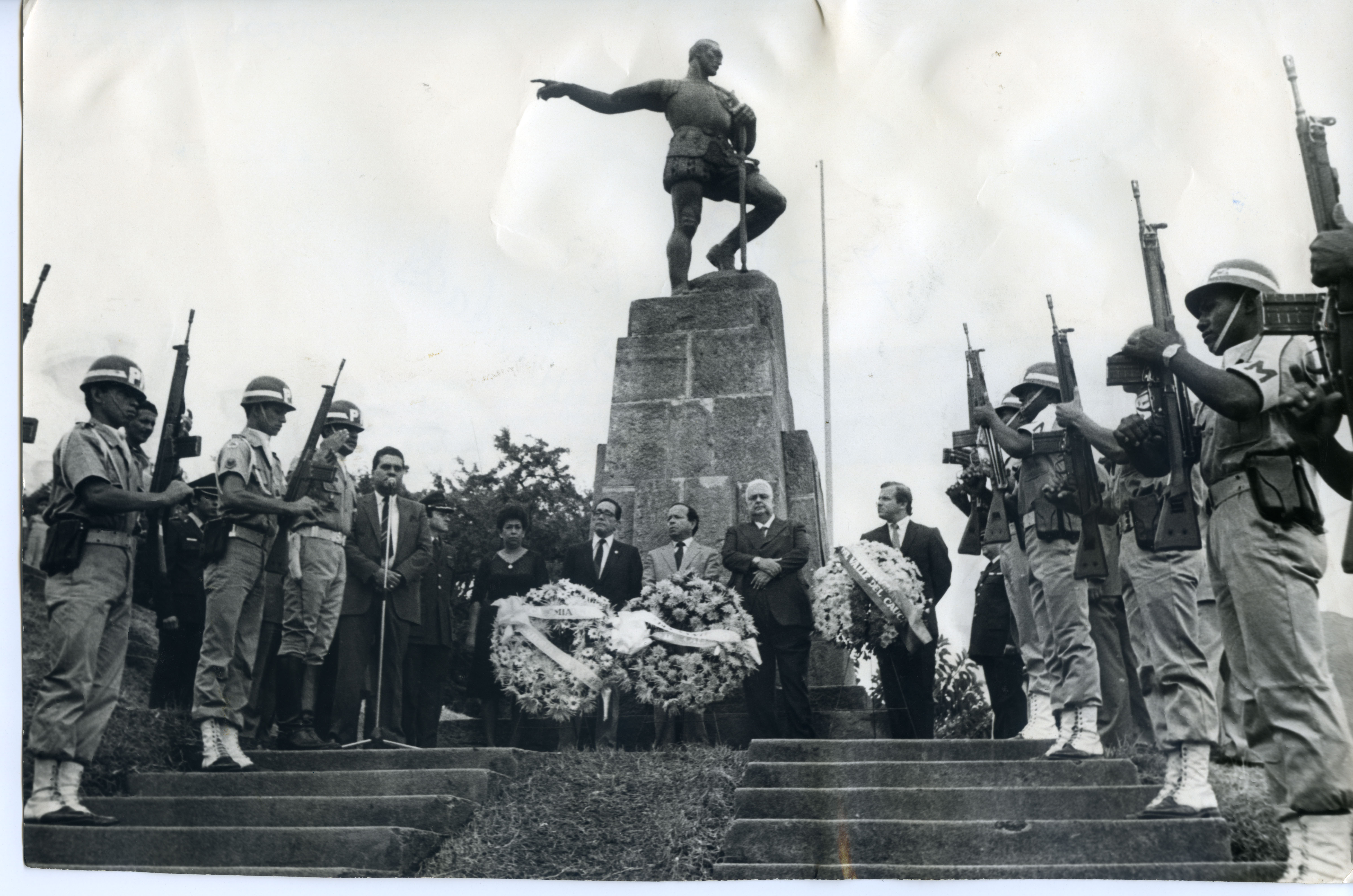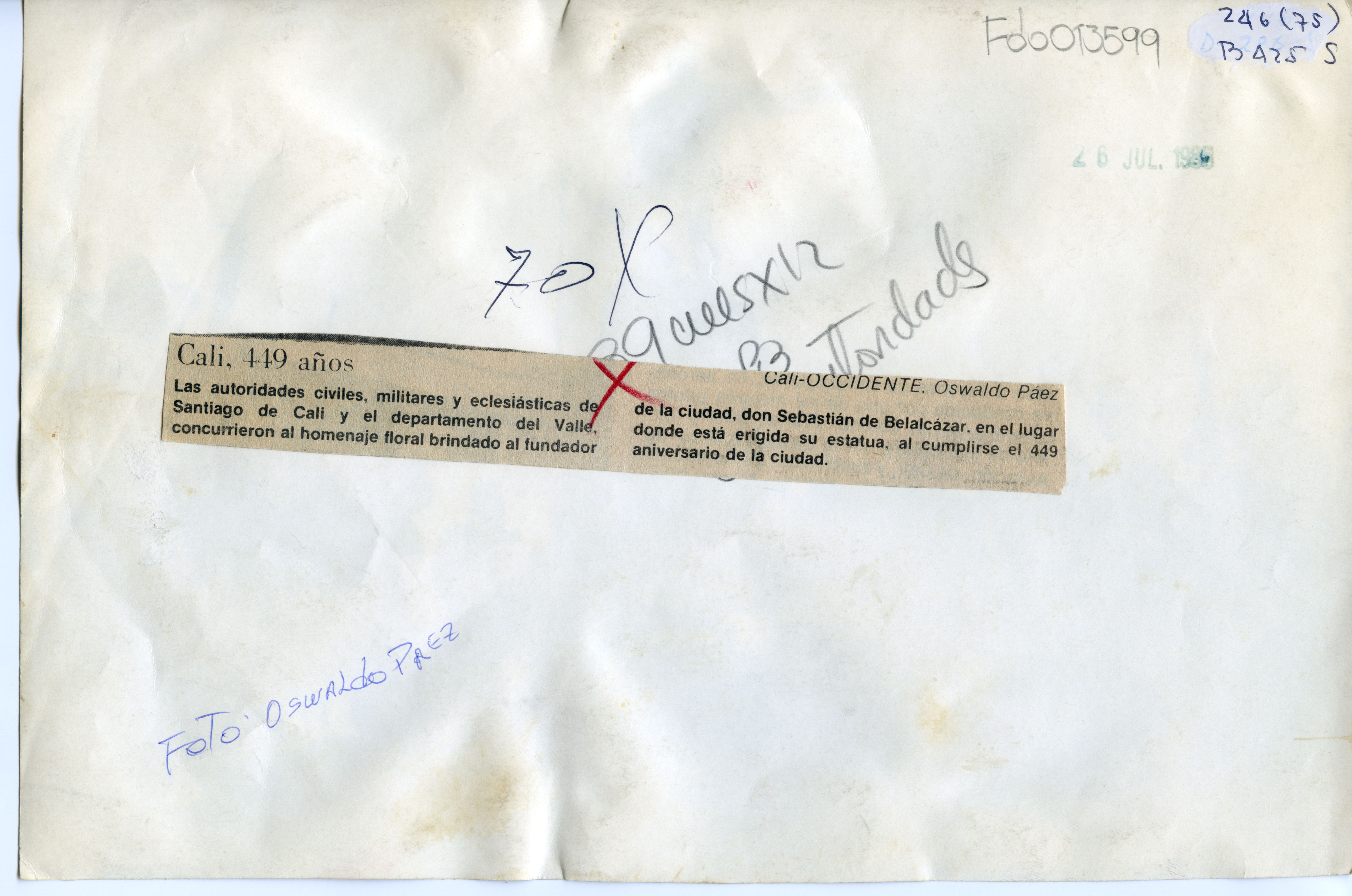 Homenaje floral a Sebastián de Belalcázar en la conmemoración de los 449 años de fundación de la ciudad, organizado por la autoridades civiles, militares y eclesiásticas.