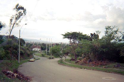 Plano general. Exterior día. Calle curva con bifurcación en segundo plano. Servicio de transporte público como punto distintivo en costado izquierdo. Panorámica de ciudad en centro izquierdo.