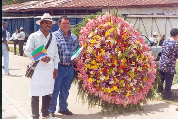 Alcalde del municipio con un silletero y sus flores ensilletadas. La Cumbre, 1998