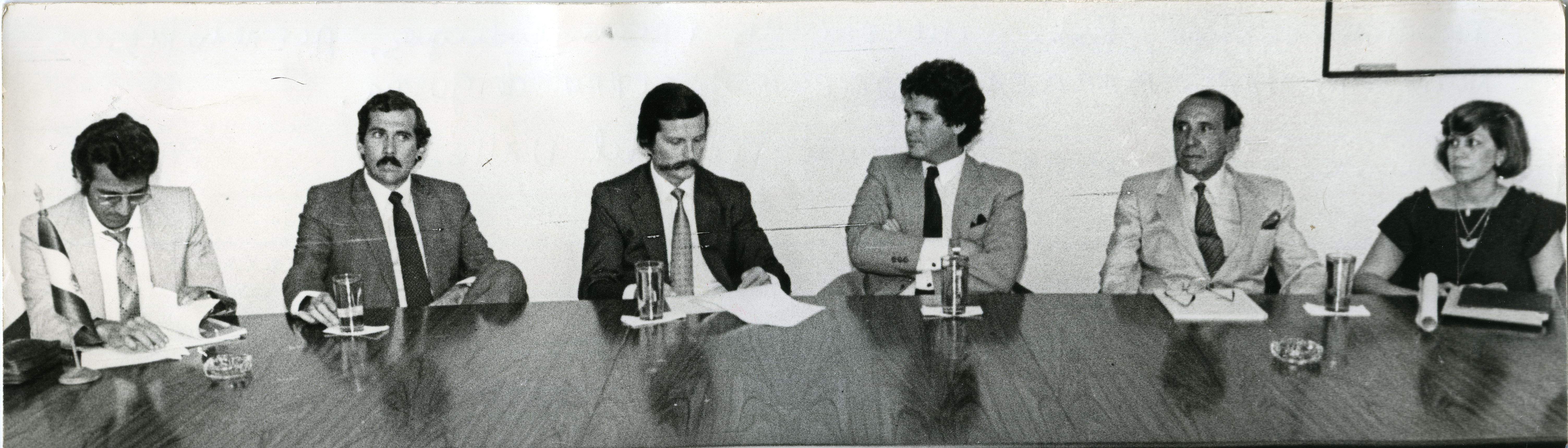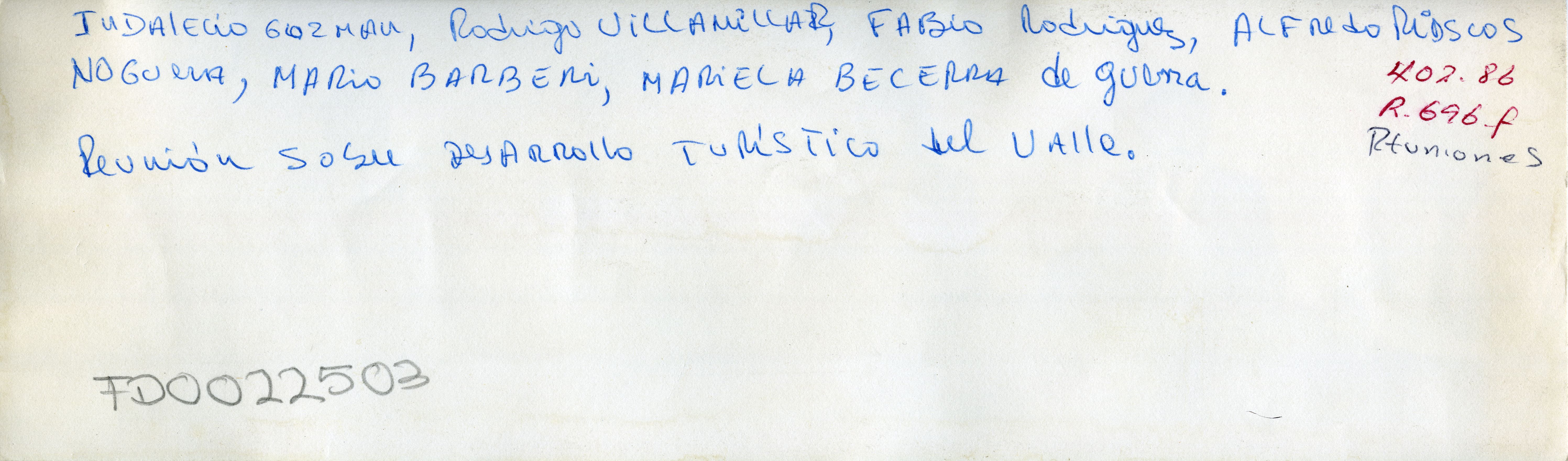 Se aprecia de izquierda a derecha: Indalecio Guzmán, Rodrigo Villamizar, Fabio Rodríguez, Alfredo Riascos Noguera, Mario Barberi, Mariela Becerra de Guerra. Reunión sobre desarrollo turístico del Valle