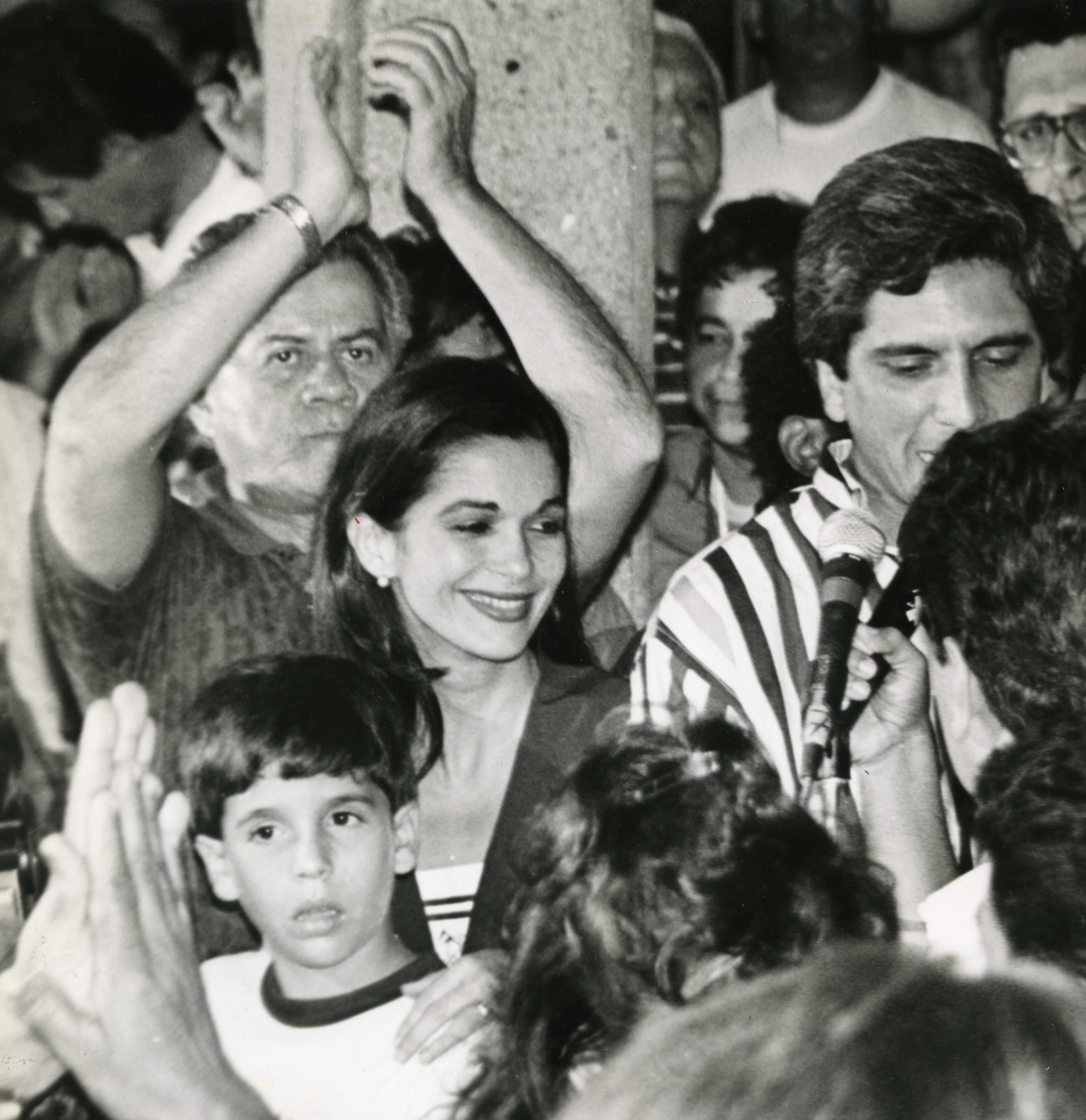 En el pie de foto dice lo siguiente: Todo era alegría anoche en la sede del nuevo alcalde de Cali. Su esposa, Luz Elena Azcárate y demás familiares le acompañaron durante todo el día en su camino al triunfo---El Archivo del Patrimonio Fotográfico y Fílmico del Valle del Cauca es responsabilidad de la Biblioteca Departamental del Valle Jorge Garcés Borrero, por convenio de cooperación suscrito con la Secretaria del Cultura Departamental, con el fin de aunar esfuerzos para su conservación, preservación y divulgación del Archivo entre la comunidad Vallecaucana, especialmente entre los estudiantes e investigadores que visitan la Biblioteca, propiciando el su uso y consulta permanente. La universidad Icesi es un colaborador en el proceso de difusión, facilitando la tecnología que permite la consulta de las imágenes.