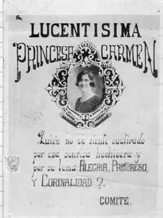 Afiche del reinado de la Simpatía. Candidata Carmelita Lozano Escobar, Tuluá, 1927.