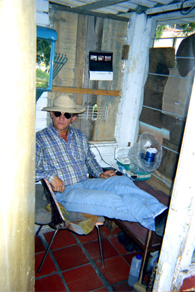 Plano medio. El vigilante de la cuadra en su caseta de vigilancia. Sostiene un cigarrillo en su mano izquierda.