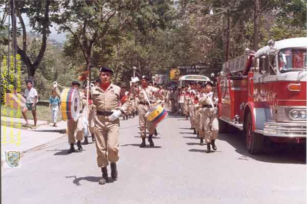 Desfile del Cuerpo de Bomberos Voluntarios de Cali por la ciudad, encabeza la banda marcial. Cali. 1993.