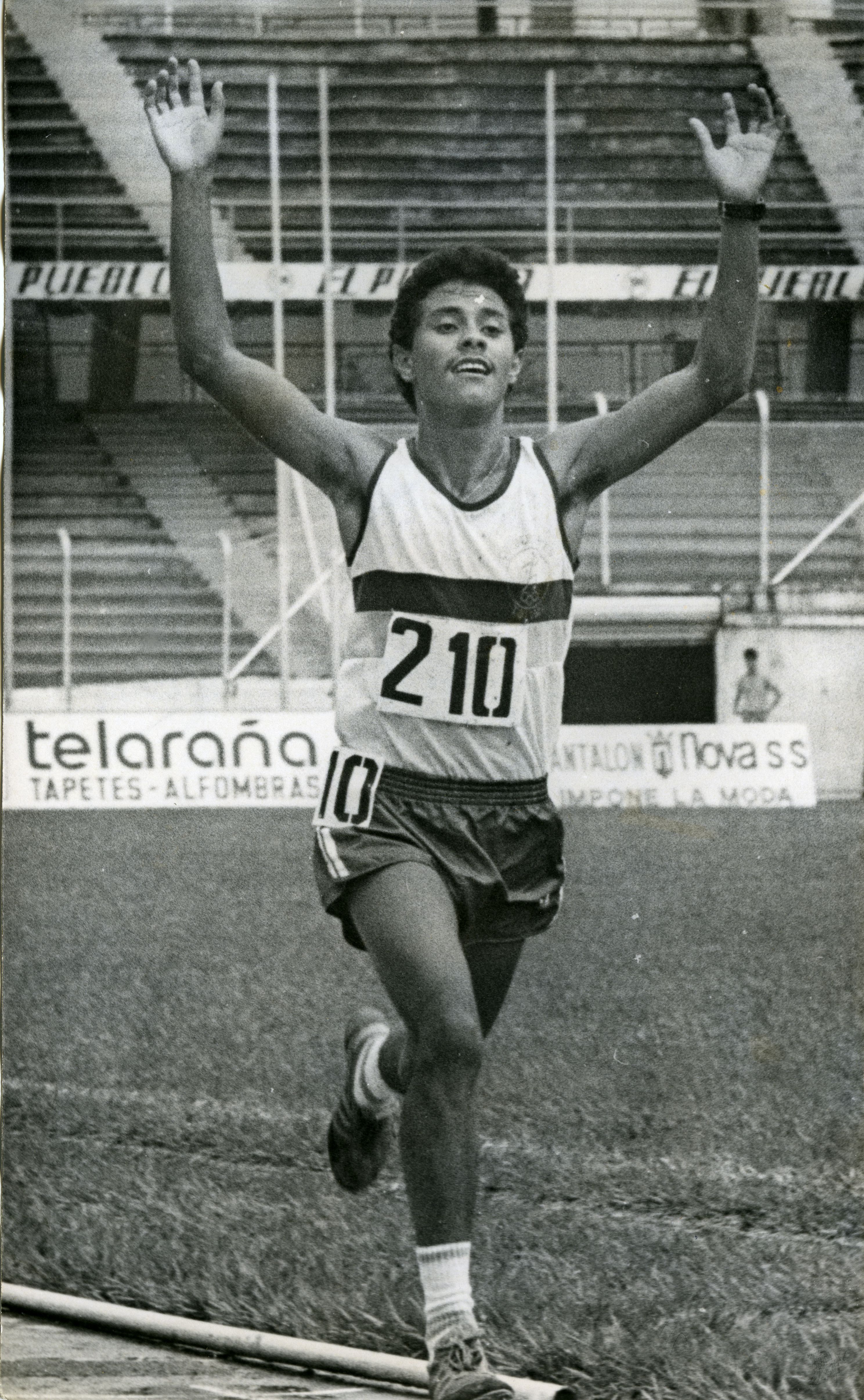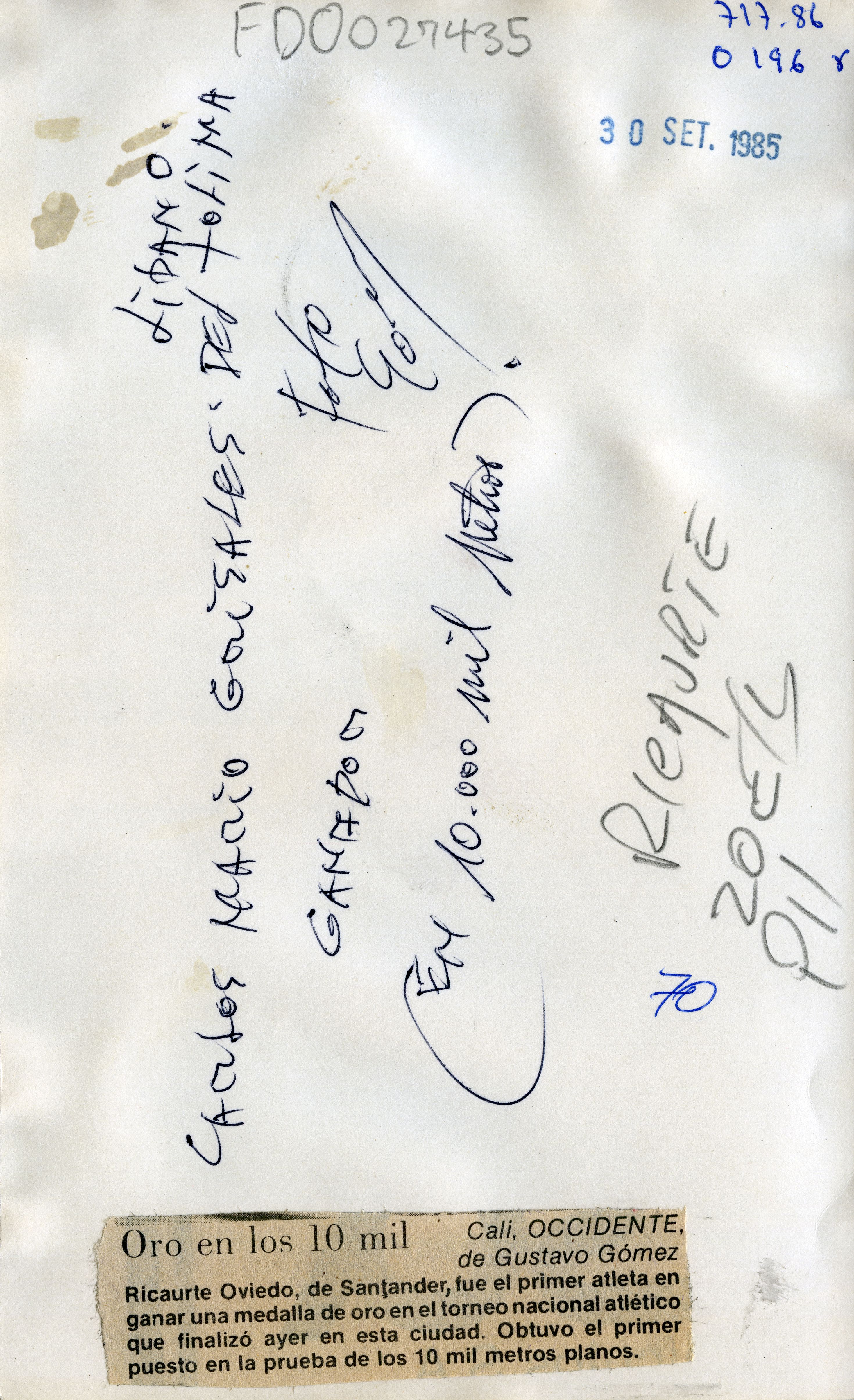 Manuscrito: Carlos Mario Grisales Del Libano Tolima. Ganador (En 10.000 mil metros). Reverso: Oro en los 10 mil. Ricaurte Oviedo, de Santander, fue el primer atleta en ganar una medalla de oro en el torneo nacional atlético que finalizó ayer en esta ciudad. Obtuvo el primer puesto en la prueba de los 10 mil metros planos.