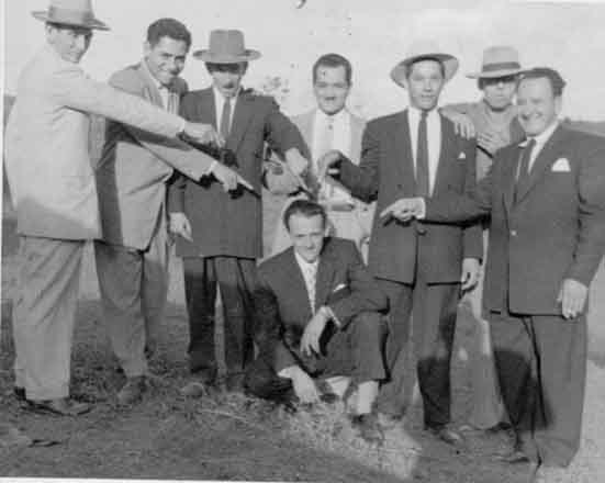 Alfonso Alvarez y su "combo" de amigos; obsérvese el uso de traje entero y sombrero, una costumbre que desapareció de nuestras tradiciones vallecaucanas. Restrepo, C.1955.