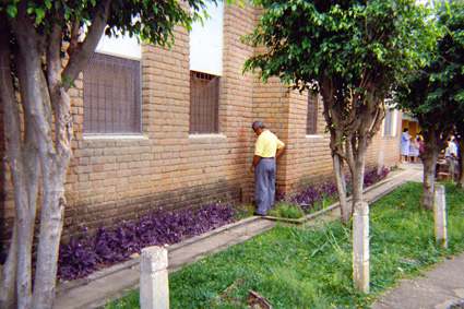 Plano Medio. Imagen tomada en exterior donde se destaca una fachada en ladrillo a la vista con varios árboles en la parte inferior. Sobre la fachada en una equina se alcanza a ver un hombre mayor orinando.
