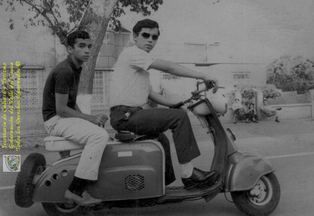 Pablo Emilio Mello y Hernán Quintero pasean en una motoneta Lambreta por las calles de Palmira, 1960