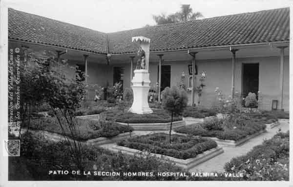 Patio interior de la sección hombres en el Hospital San Vicente de Paul, estos jardines aún se conservan. Palmira. C.1920.