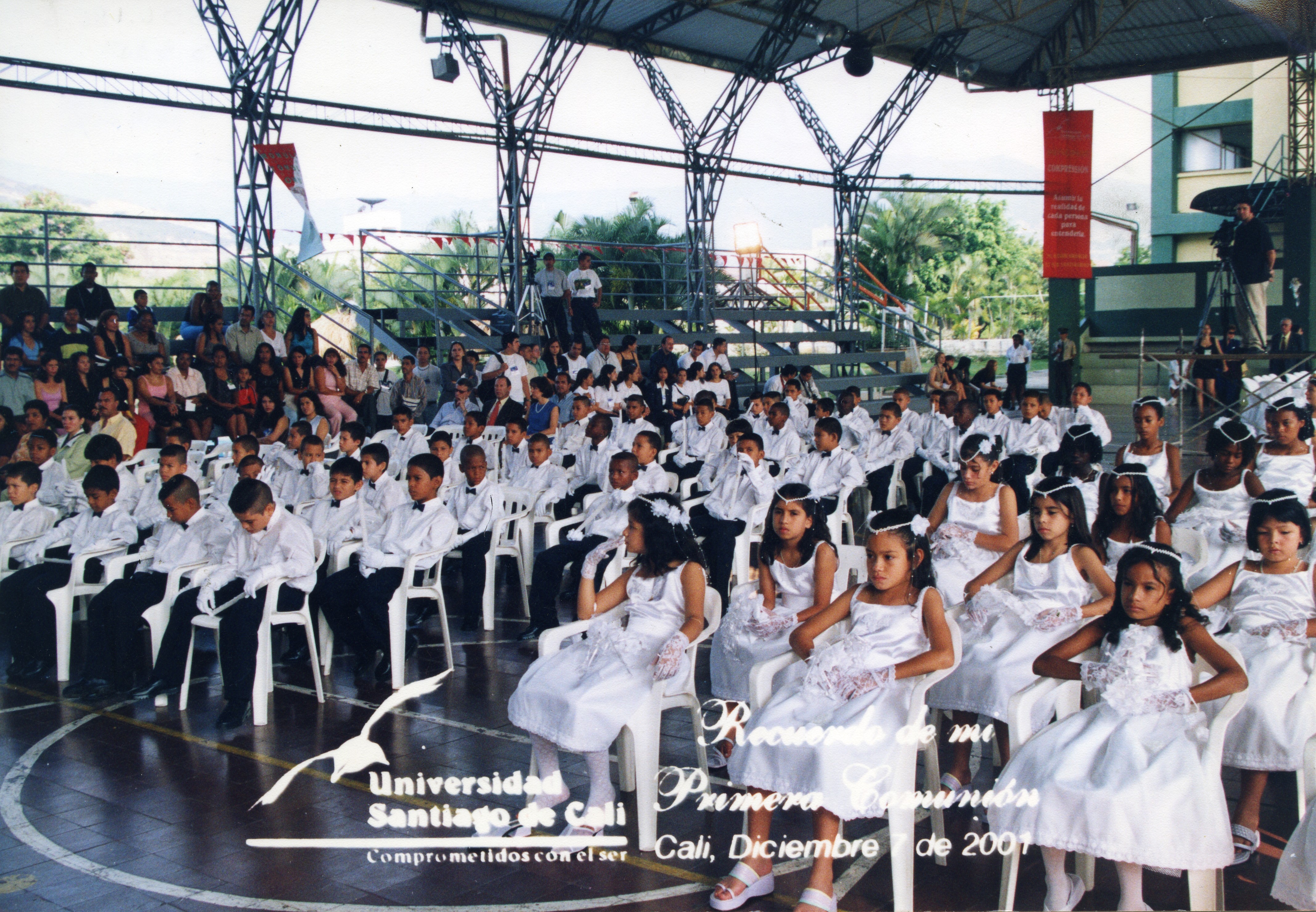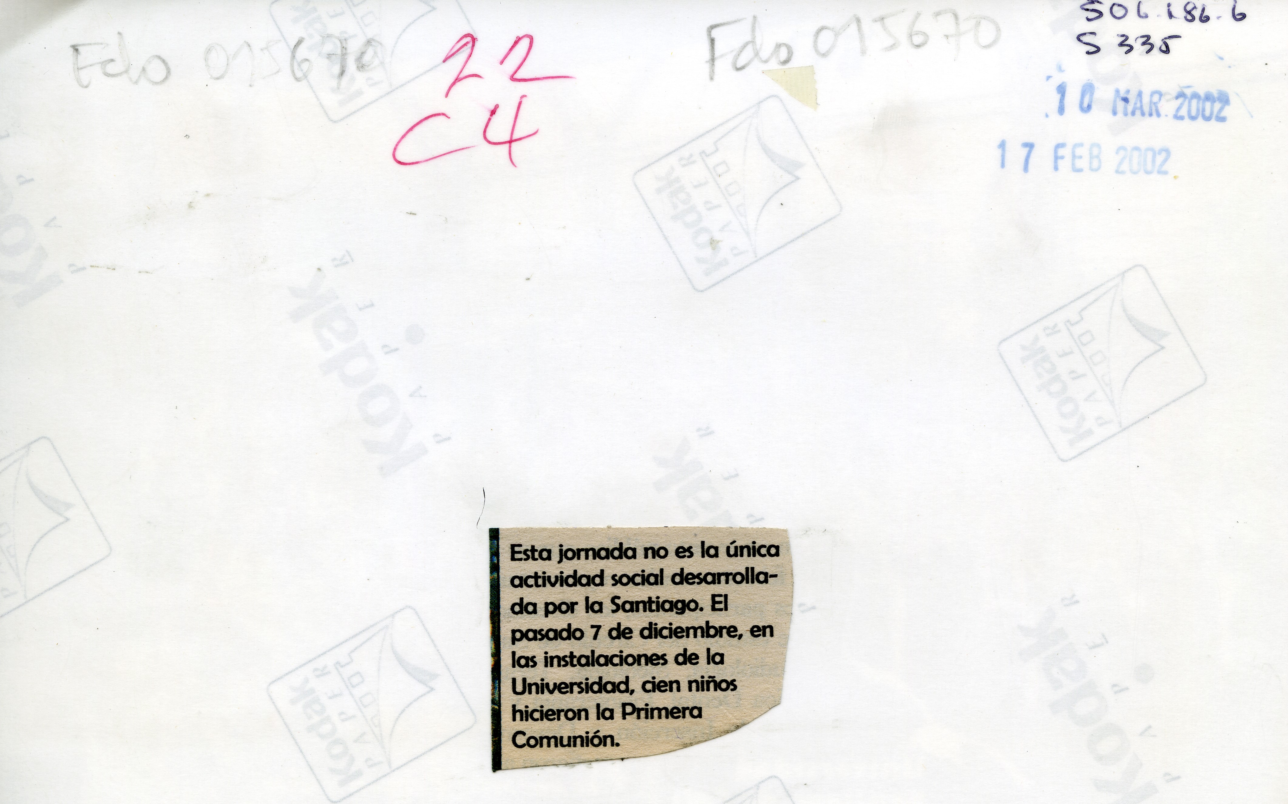 Cien niños hacen la primera comunión en la Universidad. Al reverso hay una nota: ¨Esta jornada no es la única actividad social desarrollada por la Santiago. El pasado 7 de diciembre, en las instalaciones de la Universidad, cien niños hicieron la Primera Comunión.¨