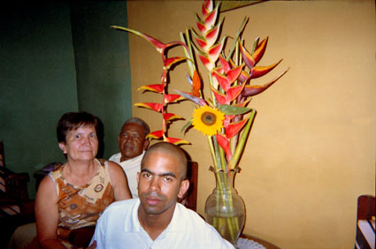 Plano medio. Interior casa. Retrato de familia. Sobresalen flores en centro de escena. División bicolor de fondo.