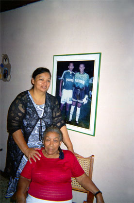 Plano medio. Interior día. Toma frontal, madre e hija. Realce de fotografía futbolistas Milton y Jairo Patiño. Sobresale textura en urdimbre de silla, en contraste con superficie lisa de pared.