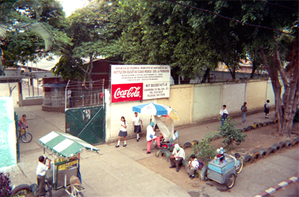 Entrada a la institución educativa Ciudad Modelo sede La Primavera. Vendedores ambulantes en el exterior. Predominio de vegetación en el bloque superior. Plano general. Toma en picado. Exterior día.