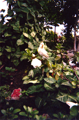 Ave posada sobre vegetación. En primer plano se observan flores de color blanco. Arriba en el cuadrante izquierdo se observa en medio de las plantas una edificación. Plano general.