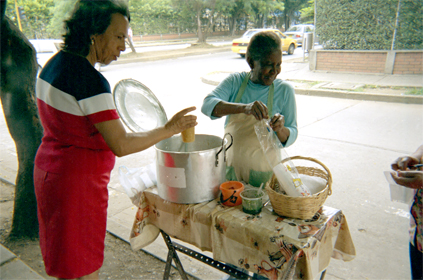 Venta callejera de Champús y empanadas. En primer plano Una mujer sostiene un baso con la bebida. Al lado derecho se observa la vendedora. Al fondo vía. Plano general.