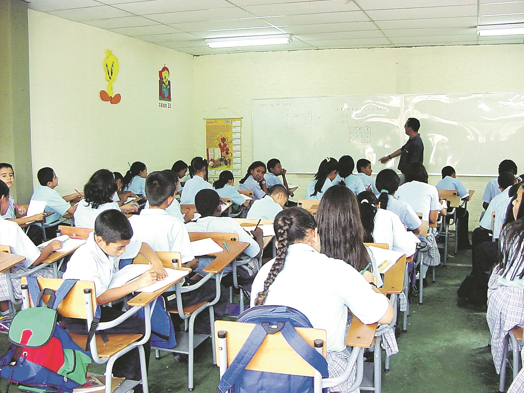 Plano general de salón de clases. Noños y niñas atienden la clase del maestro.