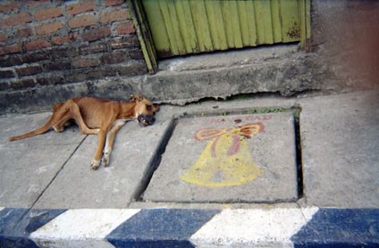 Plano medio. Exterior día. Perro agonizante, junto a diseño de campana sobre acera. Realce de franja bicolor en inferior.