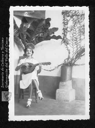 EUGENIO NEWBALL (1930). Mercedes Campo, tocando guitarra en el patio interior de la casa & 501609. PALMIRA: Biblioteca Departamental Jorge Garces Borrero.