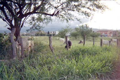 Ganado pastando en lote baldío contiguo al barrio Ciudad Córdoba. Al fondo se observan residencias y zona montañosa. Plano general.