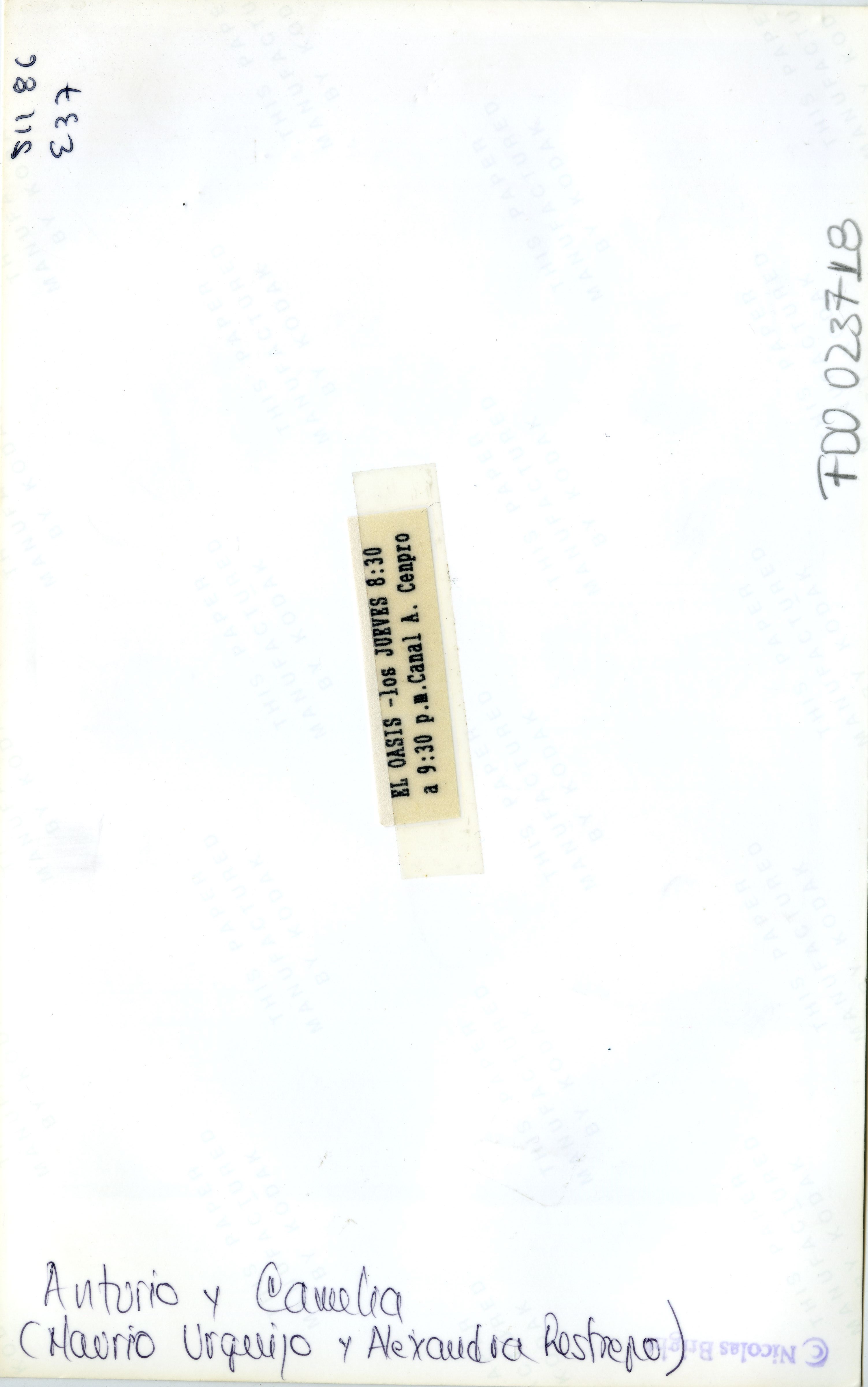 La serie El Oasis - (Cenpro) Nicolás Bright. Jueves 8:30 a 9:30 p.m. Canal A. Cenpro. En la gráfica aparecen: Anturio y Camelia(Mauricio Urquijo y Alexandra Restrepo)
