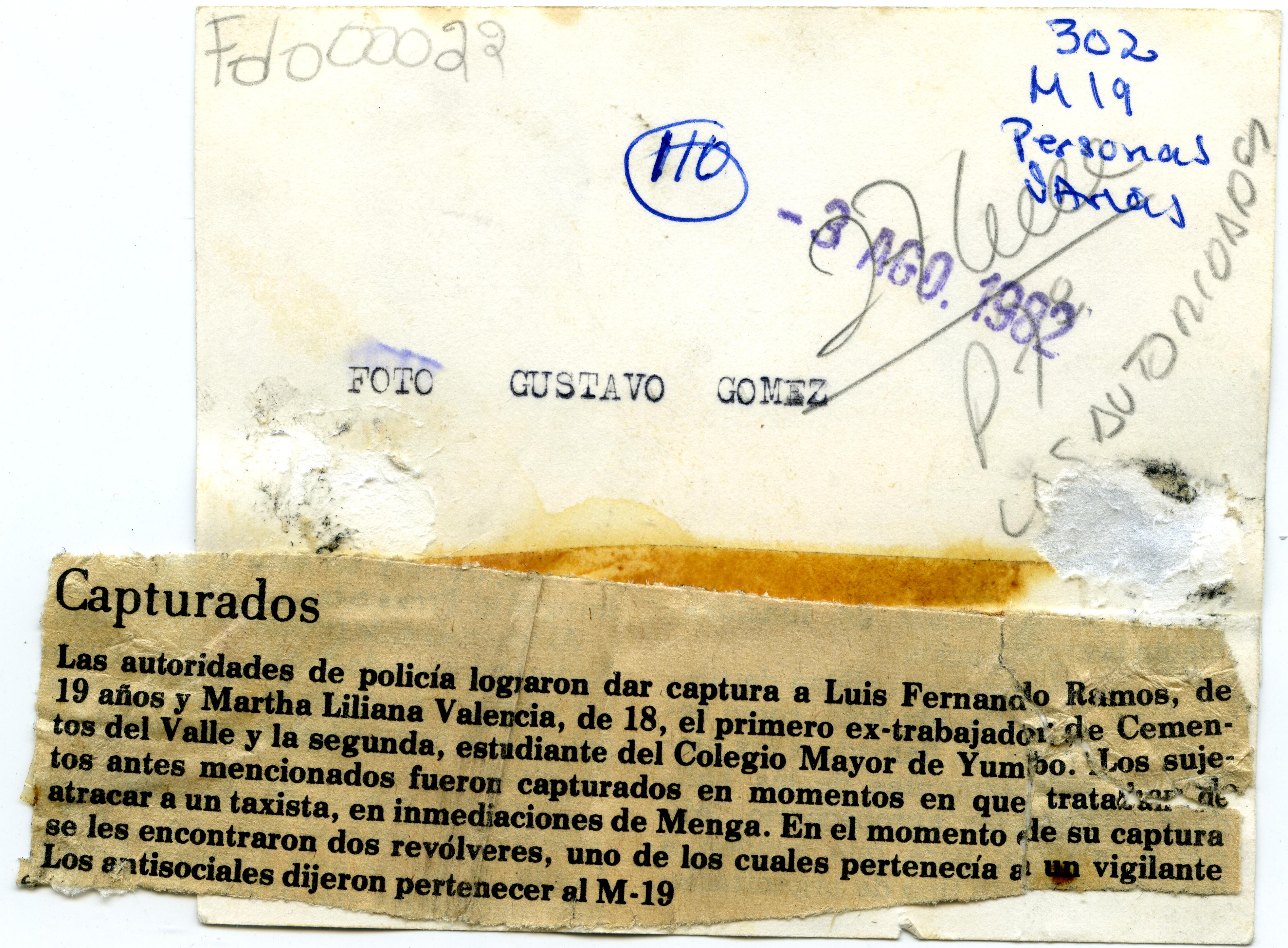 Las autoridades de policía lograron dar captura a Luis Fernando Ramos, de 19 años y Martha Liliana Valencia de 18, el primero ex-trabajador de cementos del Valle y la segunda estudiante del Colegio Mayor de Yumbo. Los sujetos antes mencionados fueron capturados en momentos en que trataban de atracar a un taxista, en inmediaciones de Menga. En el momento de su captura se les encontraron dos revólveres, los jovenes dijieron pertenecer al grupo M-19. El Archivo del Patrimonio Fotográfico y Fílmico del Valle del Cauca es responsabilidad de la Biblioteca Departamental del Valle Jorge Garcés Borrero, por convenio de cooperación suscrito con la Secretaria del Cultura Departamental, con el fin de aunar esfuerzos para su conservación, preservación y divulgación del Archivo entre la comunidad Vallecaucana, especialmente entre los estudiantes e investigadores que visitan la Biblioteca, propiciando el su uso y consulta permanente. La universidad Icesi es un colaborador en el proceso de difusión, facilitando la tecnología que permite la consulta de las imágenes.