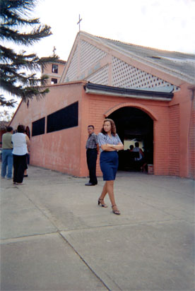 Plano medio. Exterior día. Mujer en enfoque central, con fondo de iglesia. Realce de cubierta triangular, con detalle de acabado en rombos en corte simétrico. Sujetos de fondo.