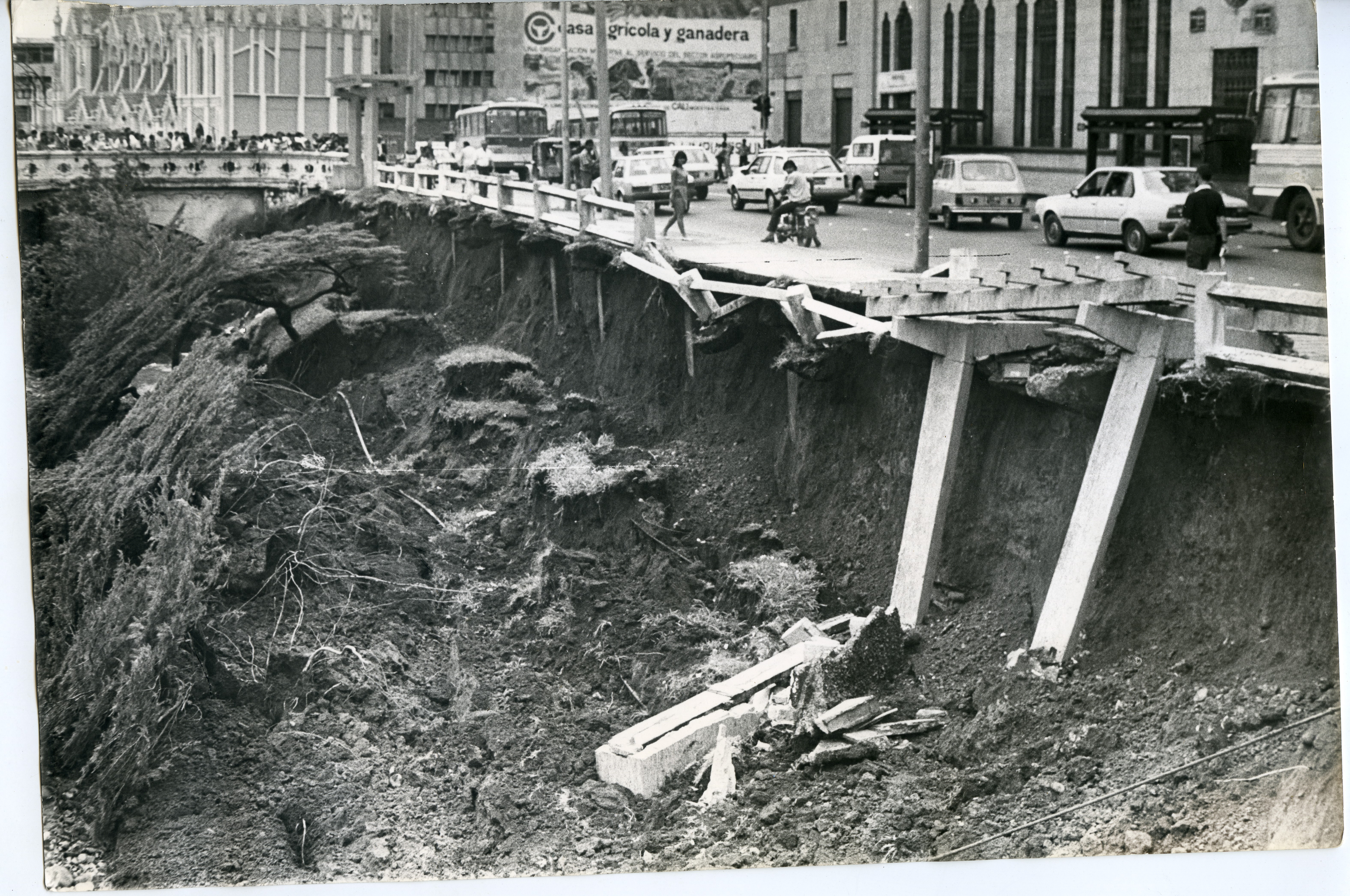 Al reverso de la fotografía se anexa el pie de foto del periódico: “Eroión del Rio Cali, un apreciable trayecto de la margen derecha del Río Cali, a la altura de la avenida Colombia entre calle 11 y 12 se desprendió ayer como consecuencia de las fuertes lluvias que cayeron en las últimas horas. Tal como se aprecia en la gráfica, parte del andén y la calzada resultaron averiados y destruidos e barandal, la pérgola y su correspondiente banca. No hubo desgracias personales”.