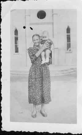 Doña joaquina con su nieto Jonathan a la salida de la misa en la iglesia de Nuestra Señora de los Remedios. Dagua, 1973.