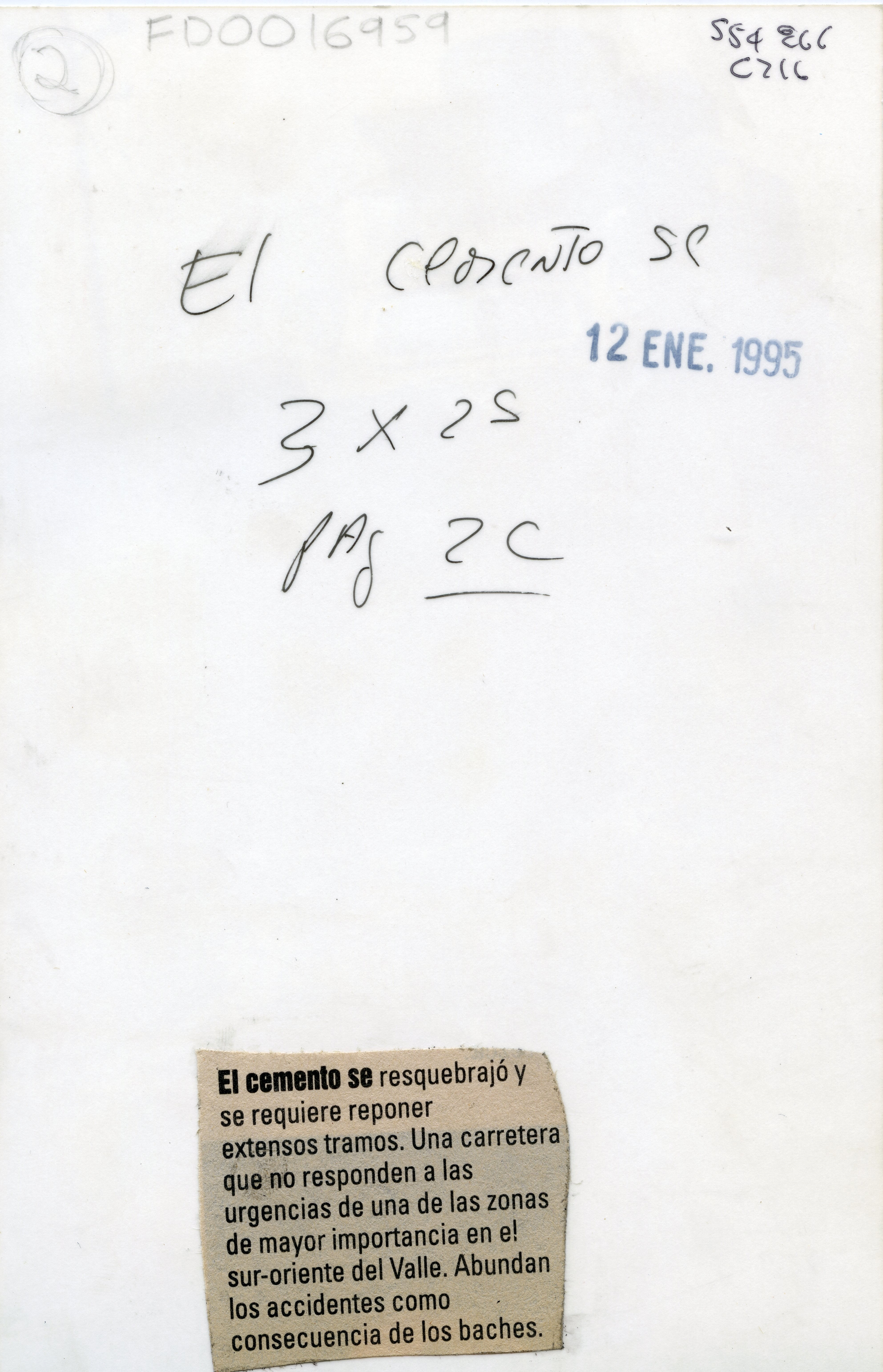 | dc.description.abstract | Al reverso de la fotografía se anexa recorte de prensa: "El cemeto se resquebrajó y se requiere reponer extensos tramos. Una carretera que no responden a las urgencias de una de las zonas de mayor importancia en el sur-oriente del Valle. Abundan los accidentes como consecuencia de los baches." | spa |