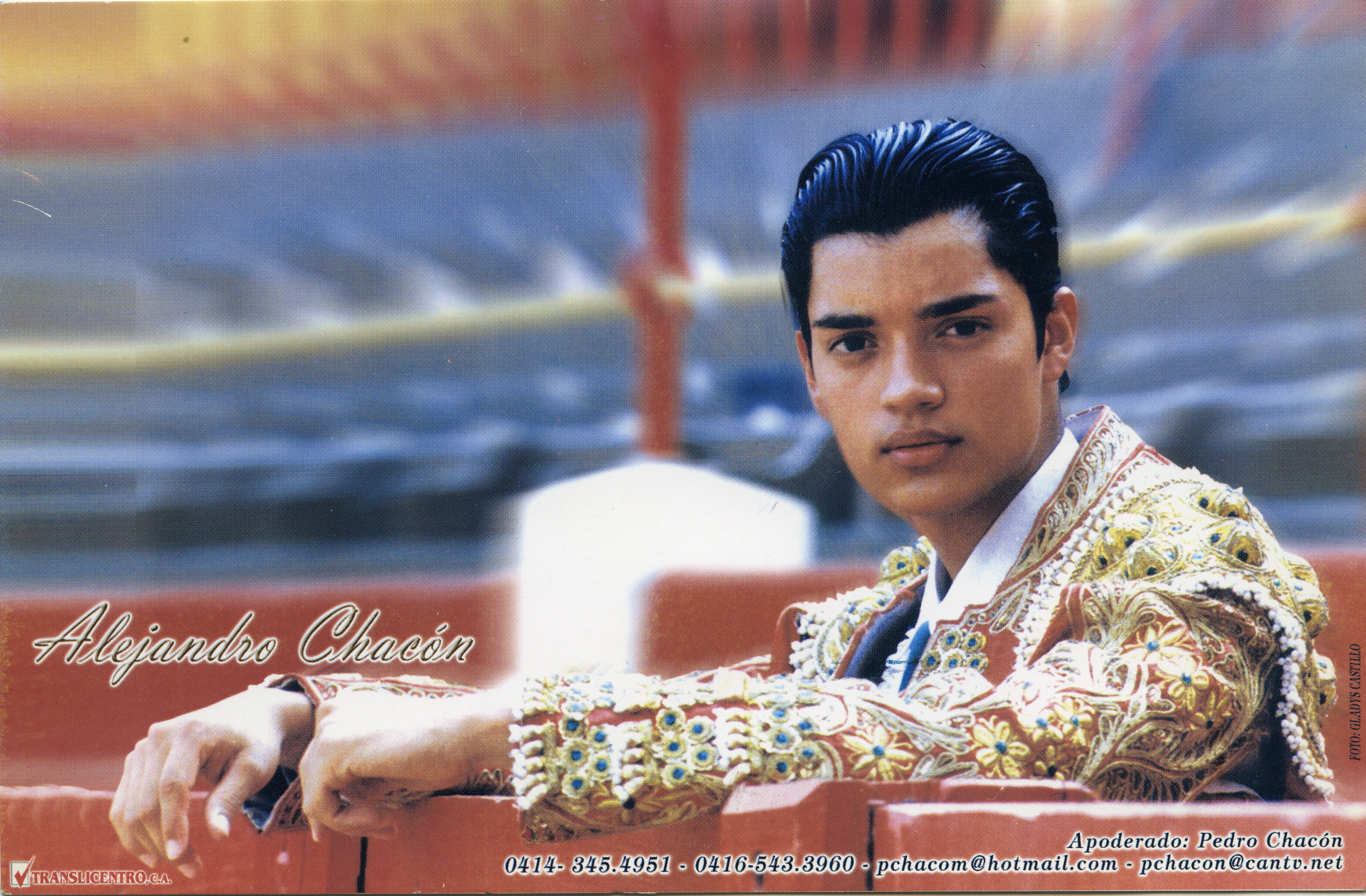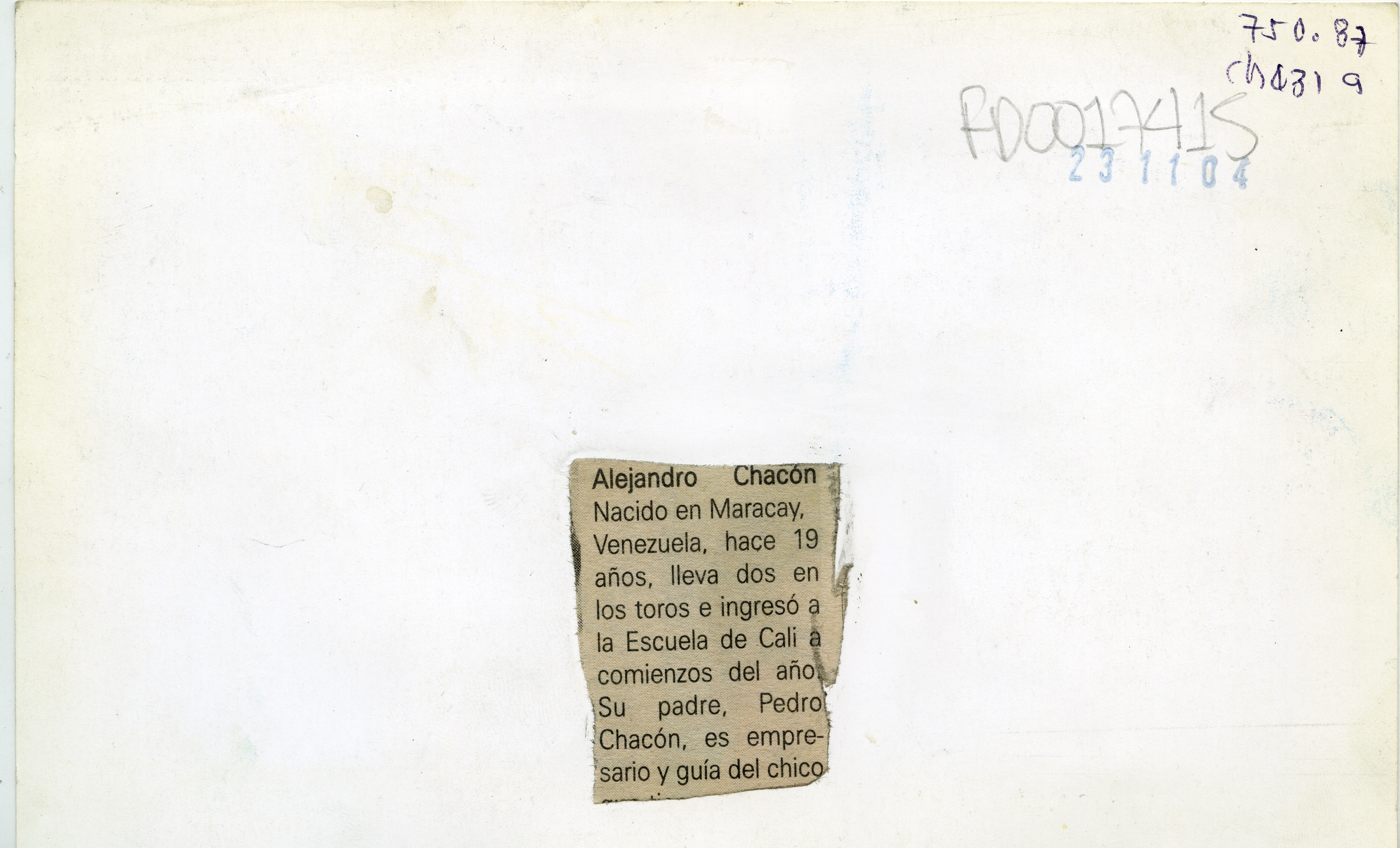 Al reverso de la fotografía se anexa recorte de prensa: "Alejandro Chacón Nacido en Maracay, Venezuela, hace 19 años, lleva dos en los toros e ingresó a la Escuela de Cali a comienzos del año. Su padre, Pedro Chacón, es empresario y guía del chico"