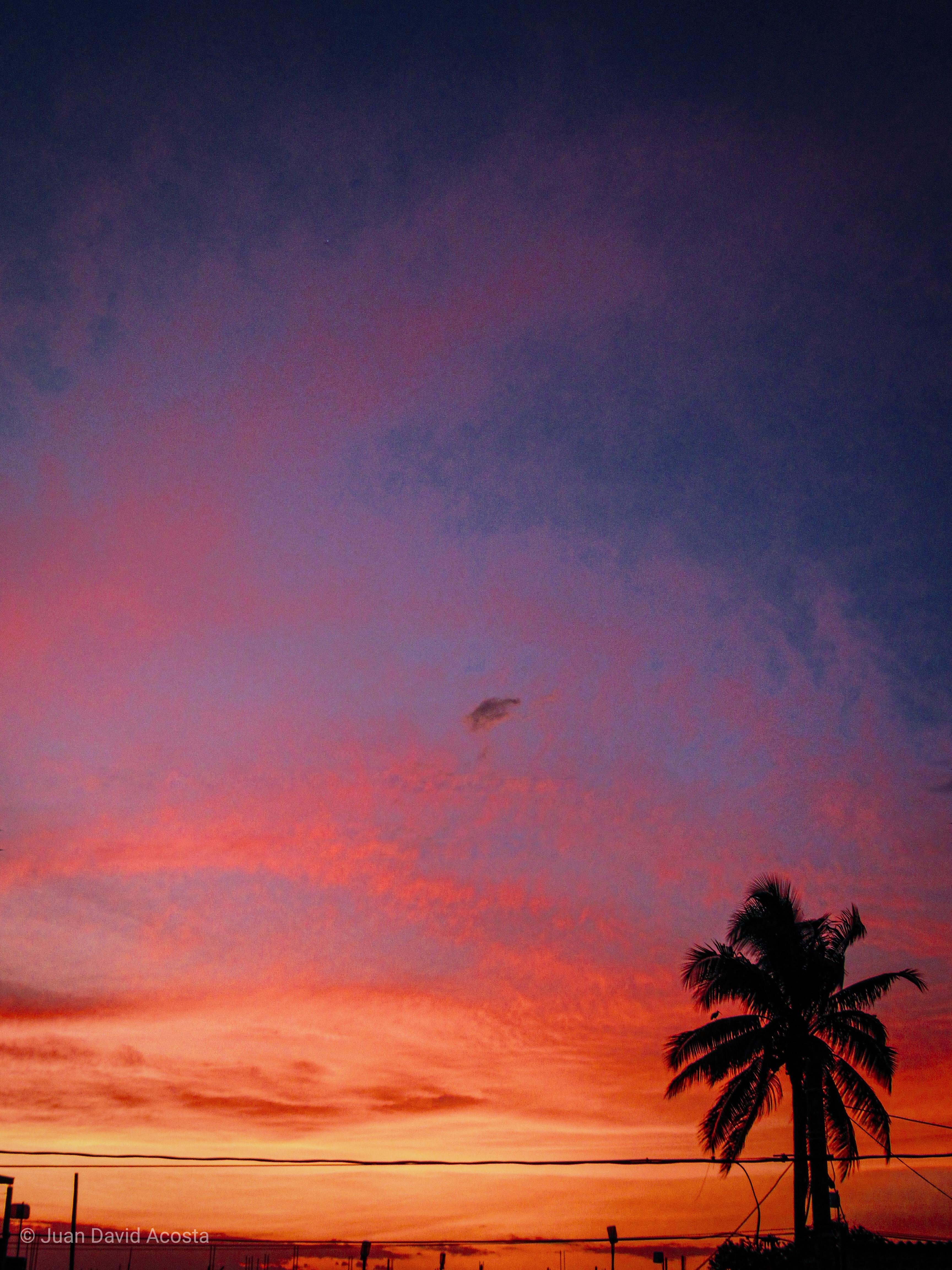Vista al cielo y su atardecer de tintes naranjas. Abajo se divisa una palmera.