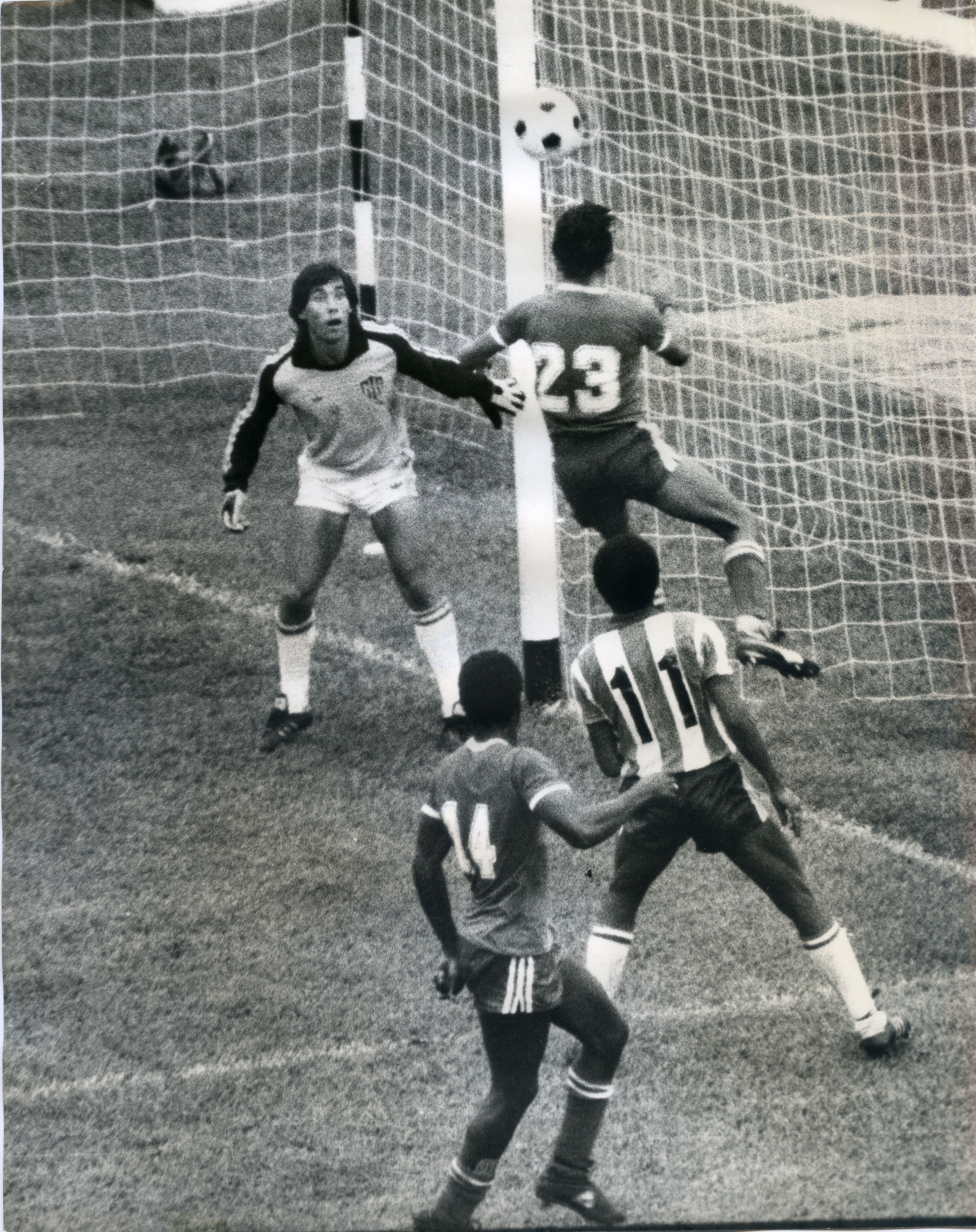 Fotografia de plano completo, donde se ve a dos jugadores Americanos y dos del Junior, en una disputa por el balon, se nota el jugador con el numero 23 saltando para golpear el balon con su cabeza, mientras el arquero esta atento debajo de la porteria atento a la pelota, y llos otros dos jugadores estan a la espectativa de la jugada