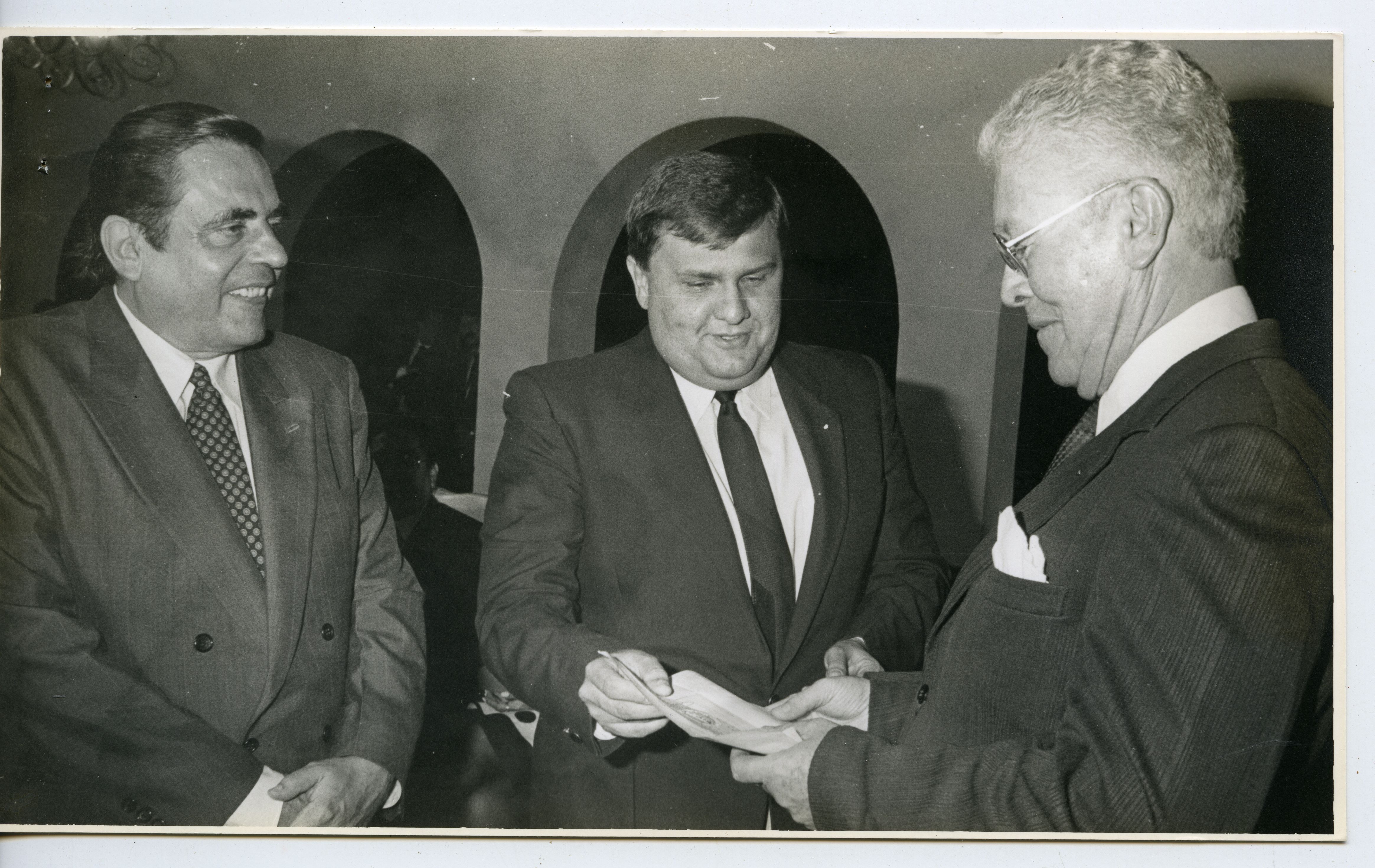 En la siguiente fotografía se observan a tres personajes distinguidos El gobernador Ernesto González al lado del académico Dagoberto Gutiérrez, quien recibe un cheque de 5 milles de parte del alcalde Fernando Ramírez