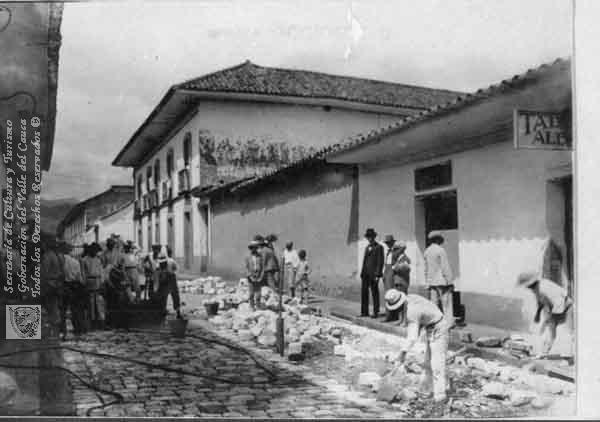s. n., s. n. & s. n. (1910). Trabajadores empedrando la calle 12 & 501971. OTRO: Biblioteca Departamental Jorge Garces Borrero.
