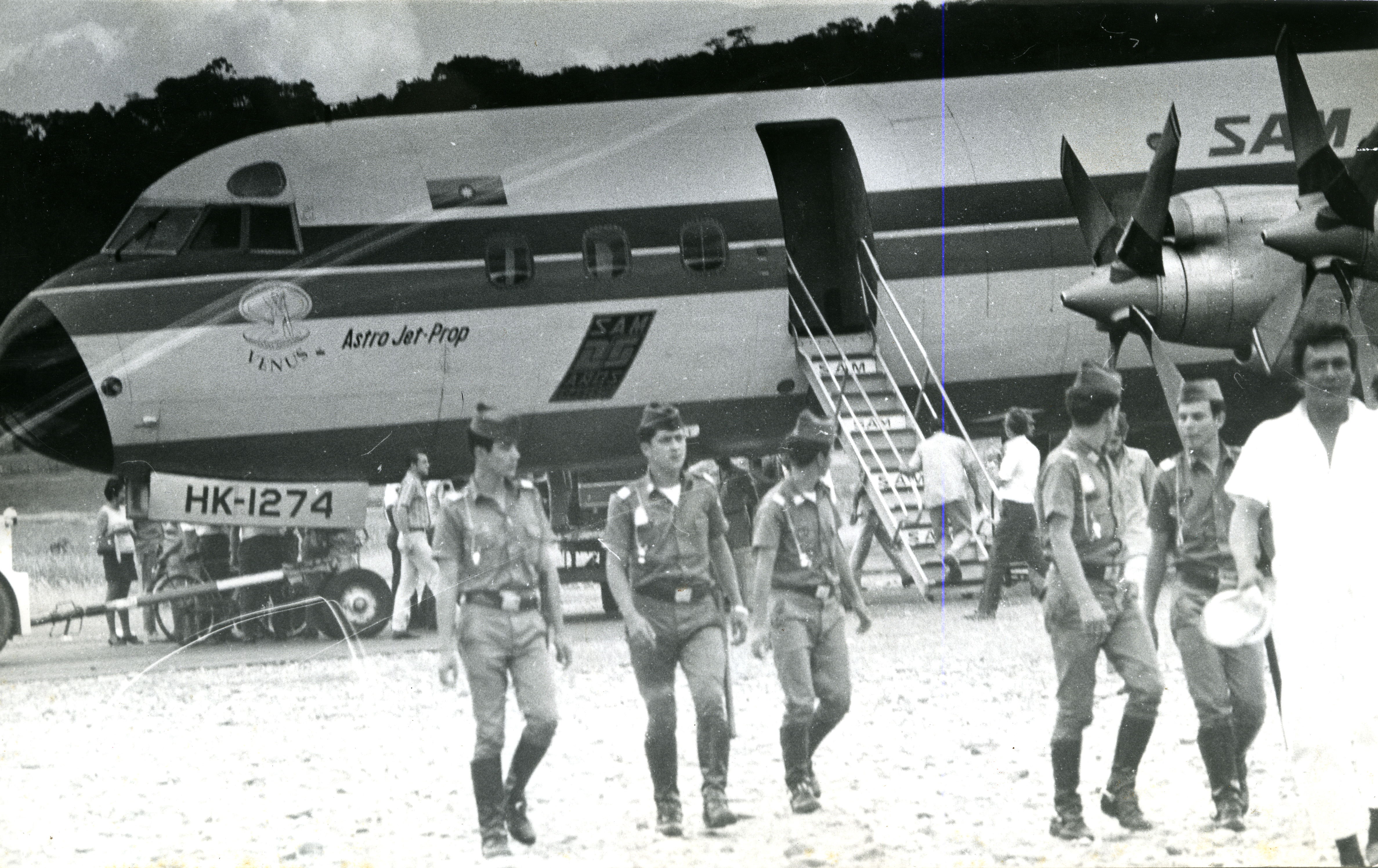 Secuestro de avión HK-1274 Aerolinea Sam de Colombia con pasajeros en mayo de 1973. Se aprecia gente y Policías en el aeropuerto