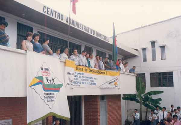 Visita del Gobernador Carlos Holguín Sardi. Discurso desde el centro Administrativo Municipal. La Cumbre, 1993