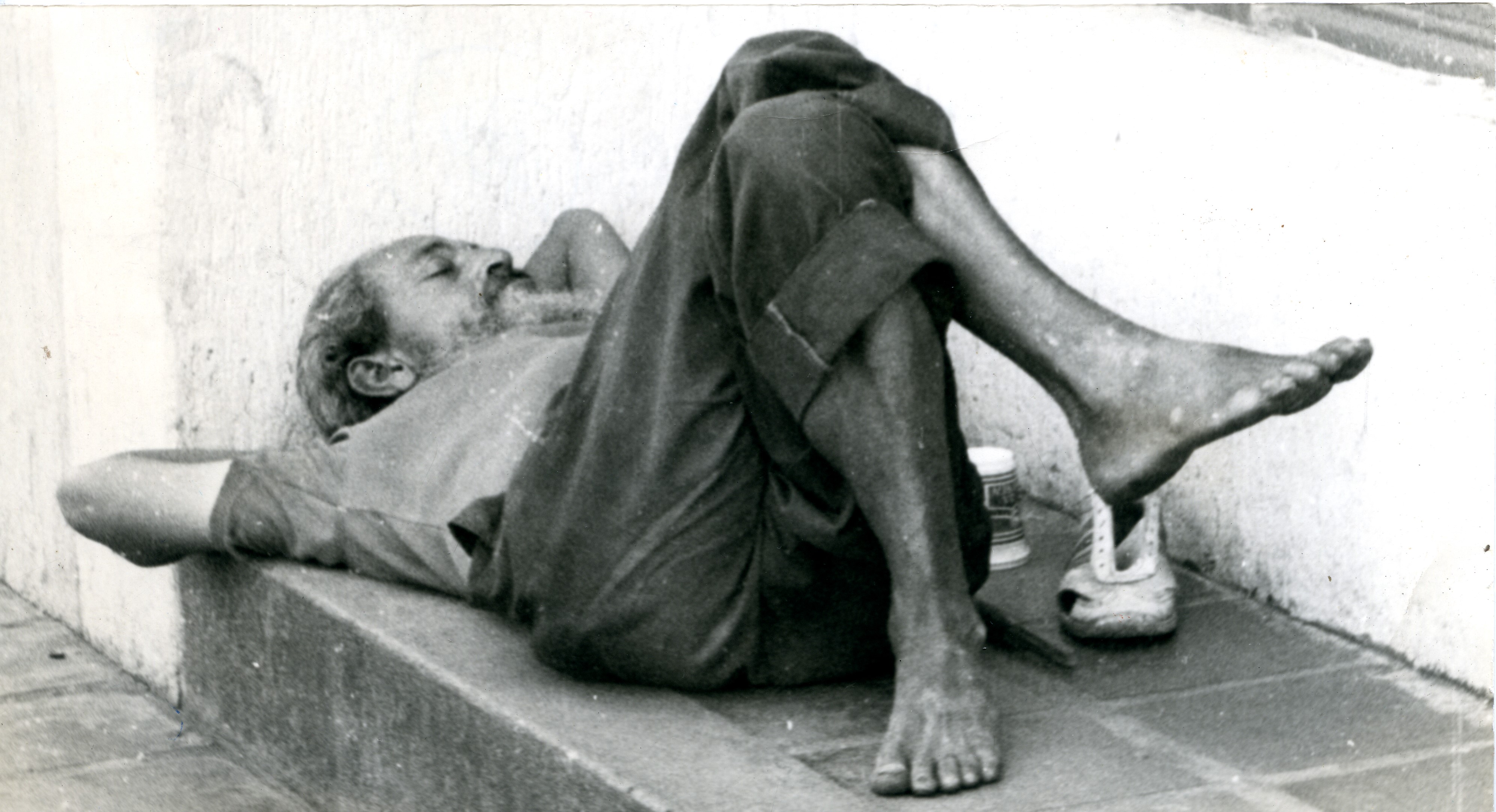 Un habitante duerme sobre un andes con los pies cruzados y descalzos. Al reverso hay una categorización de ¨mendigos¨