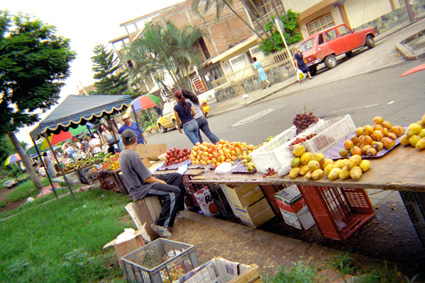 Girón Casadiego, T. M. (2005). Imagen tomada en exterior, con diagonal hacia la derecha, donde se puede apreciar un mercado ambulante, instalado en un barrio, se resalta un mesón con gran variedad de frutas. Santiago de Cali: Biblioteca Departamental Jorge Garces Borrero.