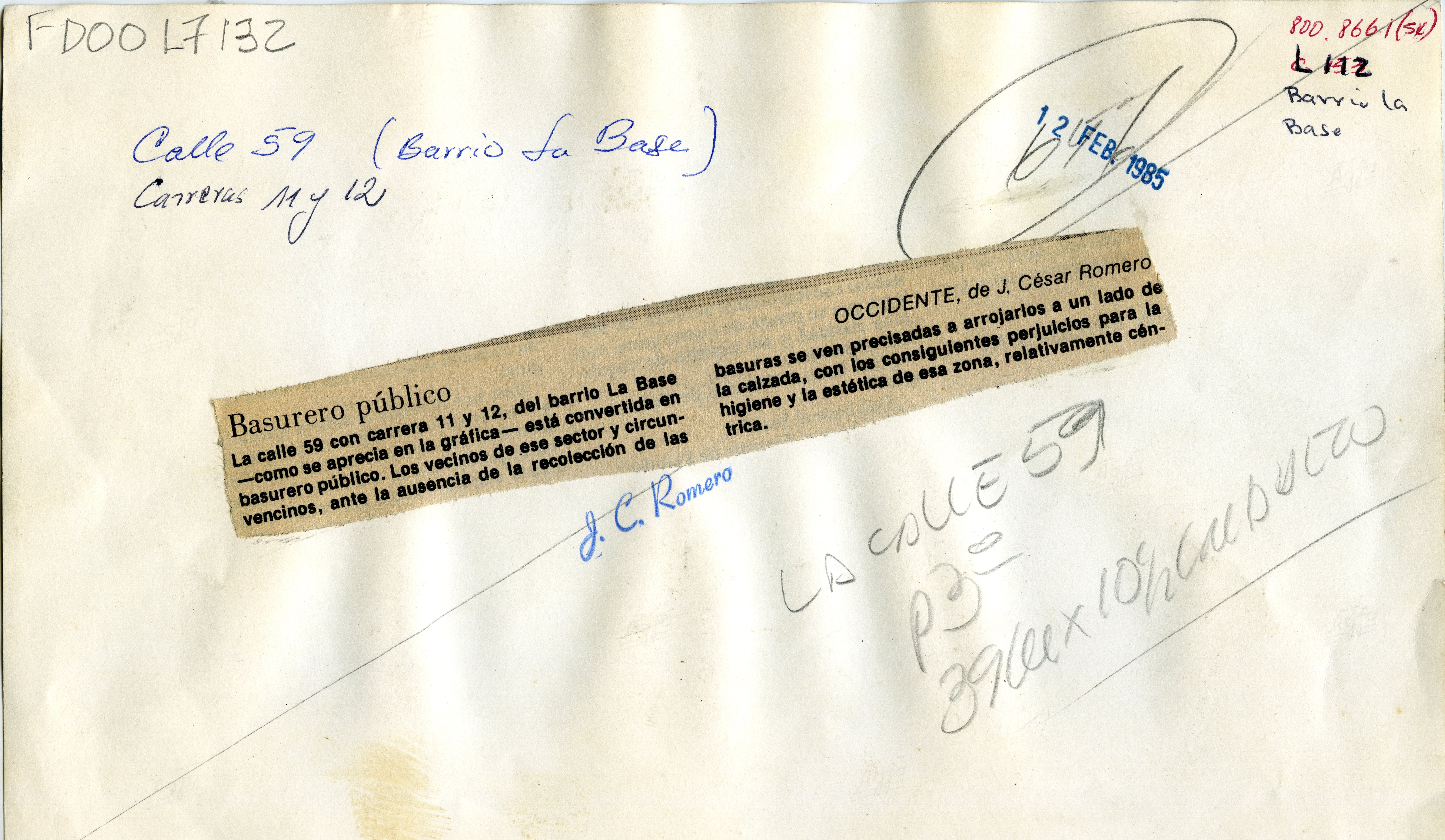 Al reverso de la fotografía se anexa recorte: "La calle 59 con carrera 11 y 12, del barrio La Base, como se aprecia en la gráfica, está convertida en basueror público. Los vecinos de ese sector y circunvecinos, ante la ausencia de la recolección de las basuras se ven precisadas a arrojarlos a un lado de la calzada, con los consiguientes perjuicios para la higiene y la estetica de esa zona, relativamente céntrica."