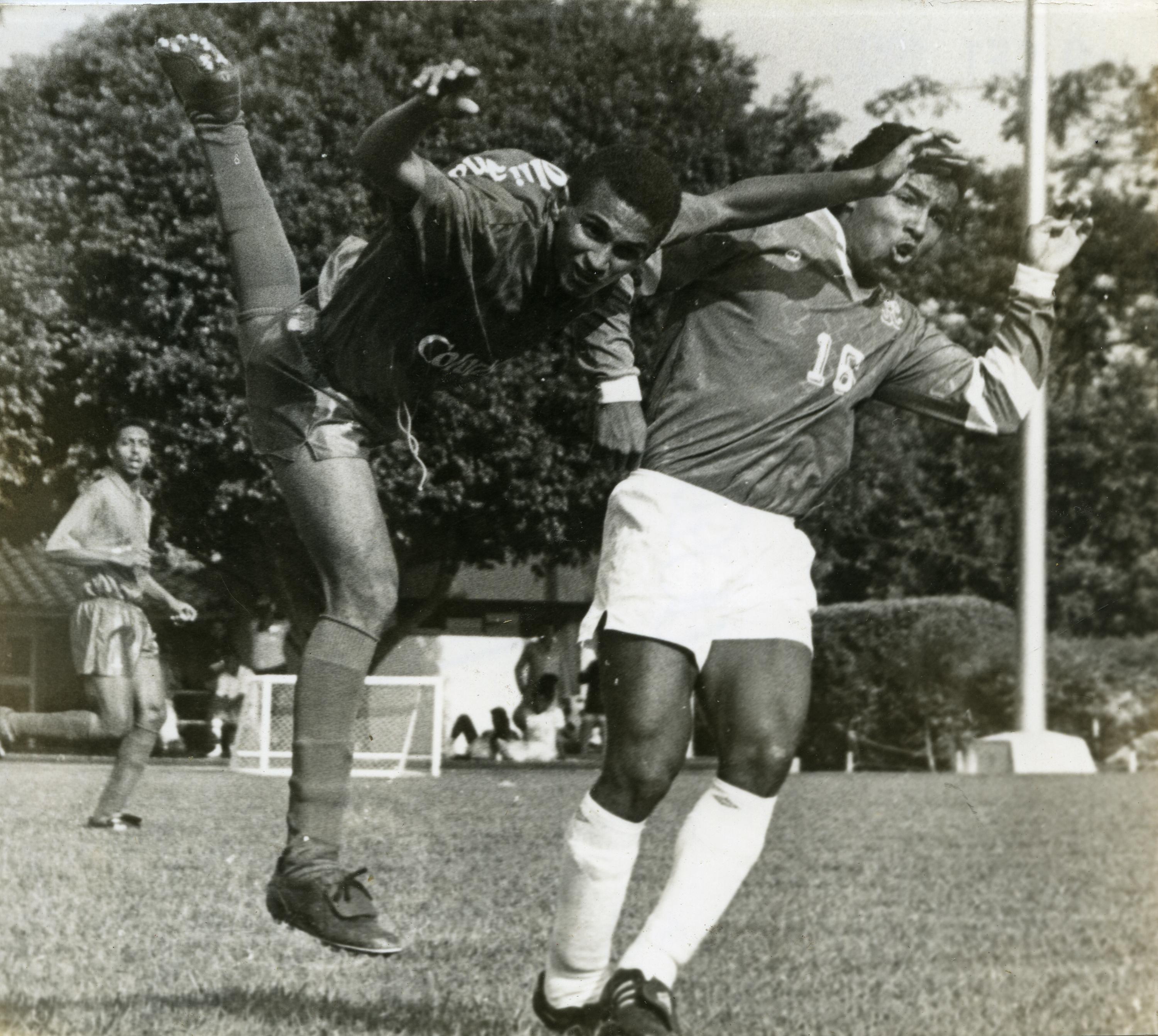 En la gráfica partido de fútbol entre los equipos América de Cali y Sport Juventus de la segunda división. Observamos jugadores luchan por el balón en el campo de juego
